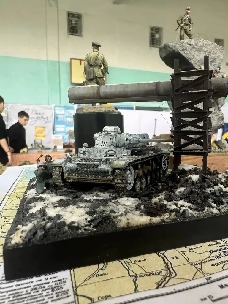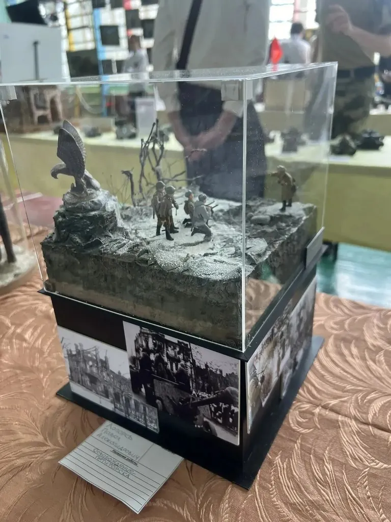 Выставка объединяет работы опытных мастеров и юных моделистов и охватывает самые разные темы: от мультфильмов и сказок до героических страниц Великой Отечественной войны, СВО, Чеченской и Афганской войн, других локальных военных конфликтов.